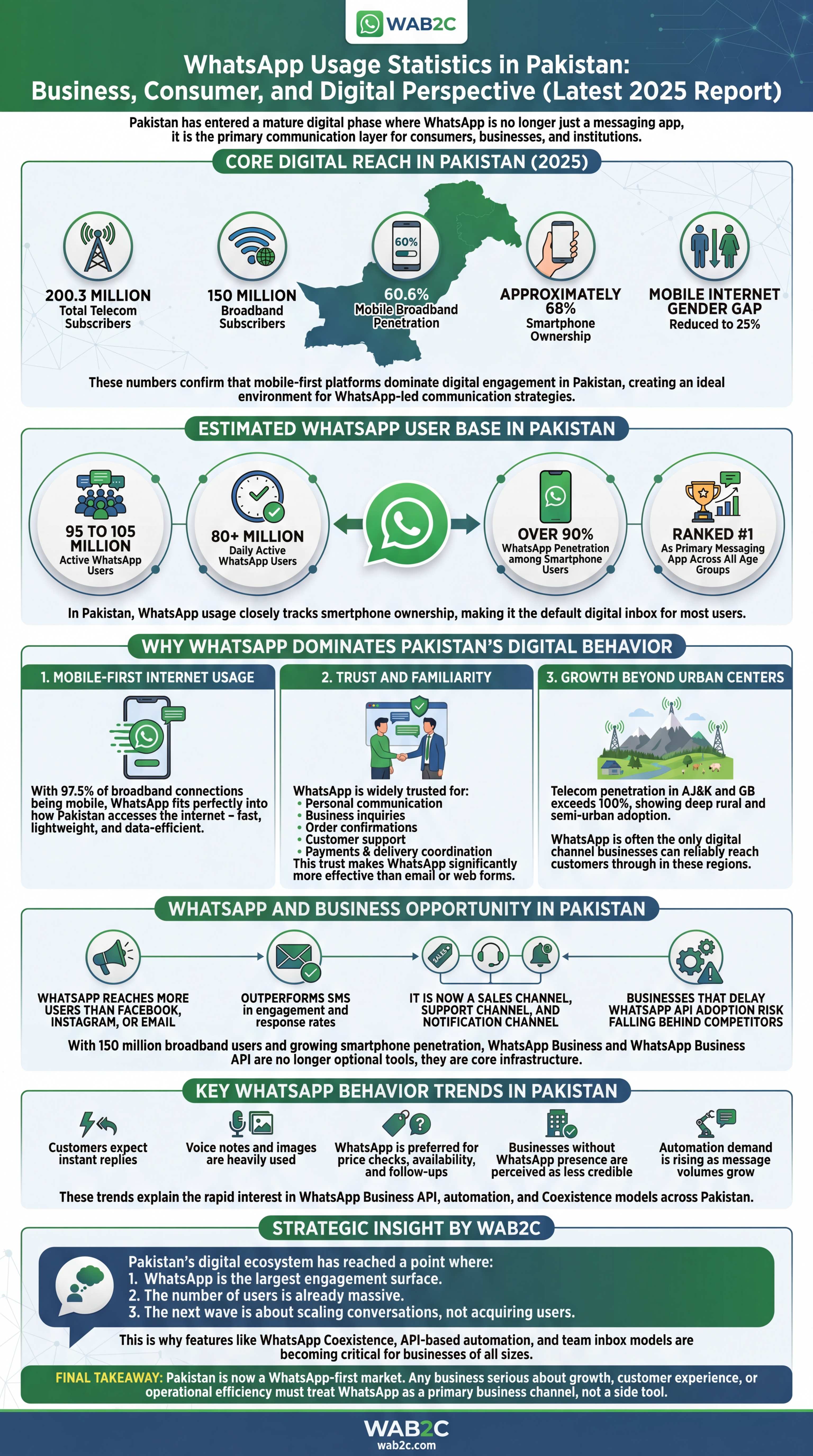 Free downloadable infographics with Pakistan WhatsApp statistics, usage trends, and business insights. Perfect for presentations, reports, and strategic planning.
